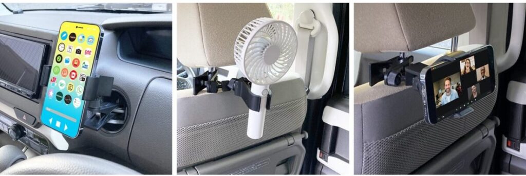 「AQ. なんでもクリップ」は、車内のスマホホルダーとしてエアコンのルーバー、サンバイザー、ヘッドレストなどへの取り付けが可能です。またクリップタイプなのでスマホ以外でも、ハンディファンや懐中電灯などをホールドするといった使い方もできます。車外でもテーブルでのスマホスタンドやキャンプでのランタン固定など、さまざまなシーンで“何か”をホールドしたいときに使えるアイテムです。