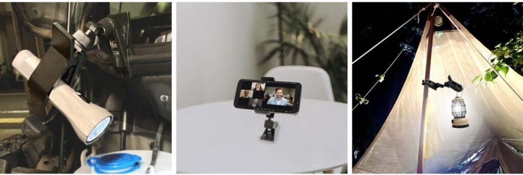 ■「AQ. なんでもクリップ」は、スマホホルダーとしての機能を軸に、傘やハンディファン、ランタンを固定するなど車内・車外問わず、幅広い用途で使えるアイテムです