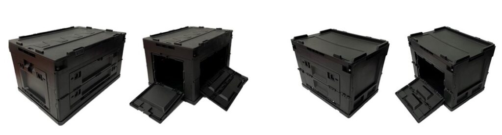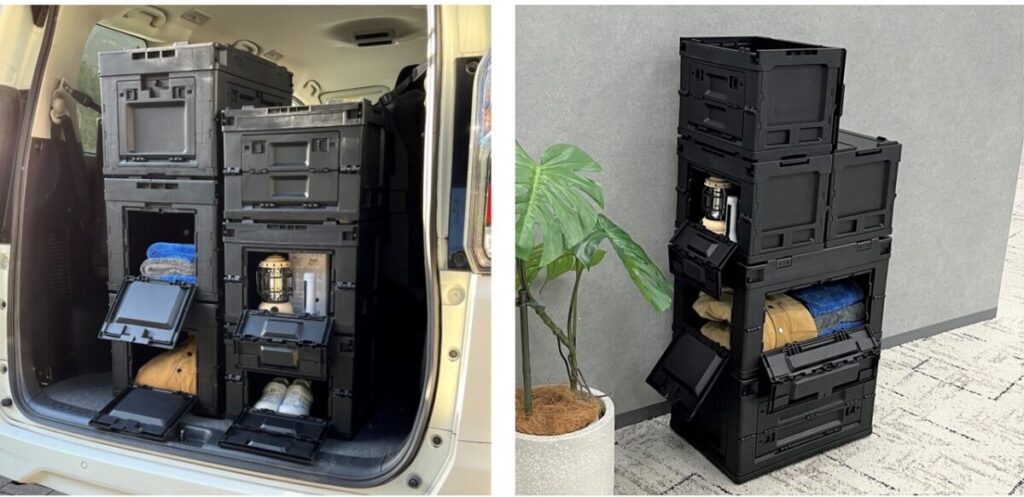 「AQ. サイドオープンコンテナ」は、積み重ねることも多い折りたたみ型コンテナの使い勝手を生かせるよう、側面にも扉を設けています。同タイプのコンテナは上部からのモノの出し入れしかできないものが多く、積み重ねて使用した場合、全て降ろさないと出し入れができないという不満の声が多くあり、それを解消したのがこの商品です。クルマのトランクでの使用だけでなくご家庭での日常使いやアウトドアなど多様なシーンで活躍します。