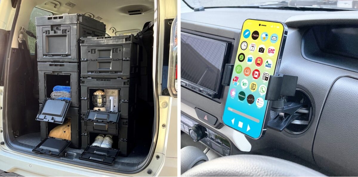 折りたたみ型コンテナの「AQ. サイドオープンコンテナ」は、積み重ねて使用した場合でも側面についた扉からモノの出し入れができるのが特徴だ。50と20の2サイズ展開で、50の上に20が2つピッタリ載せられるため組み合わせて使うことも可能である。「AQ. なんでもクリップ」はスマホをはじめ、傘やハンディファン、ランタンを固定するなど車内・車外問わず、幅広い用途で使えるアイテムとなる。