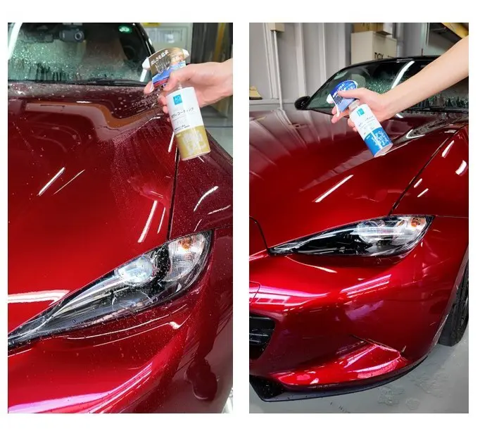 洗車した後のボディが濡れた状態でスプレーして拭き上げるだけで簡単に保護膜を形成できるコーティング剤です。ボディに付いた水が驚くほど転がる抜群の水はじきを実現する「撥水」タイプと、カルナバ(※)配合でボディ全体に深みのあるツヤと輝きを与える「艶」タイプの2種類をラインアップ。どちらも液性は中性であらゆるボディ色に対応し、約3カ月の耐久性能となっています。また、ドアバイザー、未塗装樹脂部分、メッキ部分、ホイールにも使うことができます。