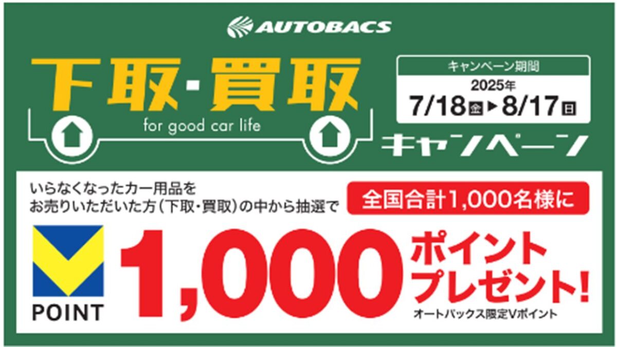 買取サービスの本格スタートに合わせ、2025年7月18日(金)~8月17日(日)の期間中、対象店舗にて下取・買取をされたお客様の中から抽選で1,000名様に、オートバックス限定Vポイント1,000ポイントをプレゼントするキャンペーンを実施します。