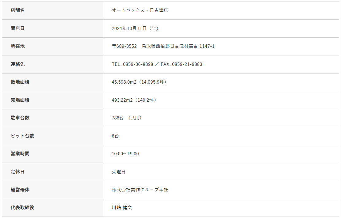 株式会社オートバックスセブン(代表取締役 社長:堀井勇吾)と加盟店契約を結んでいる株式会社美作グル−プ本社(代表取締役:川嶋健文)は、2024年10月11日(金)に「オートバックス・日吉津(ひえづ)店」を新規オープンいたします。