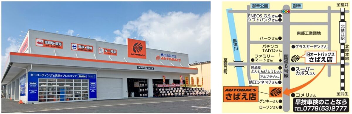 移転先は、旧店舗から南西に約0.4km、国道8号線沿いの複合施設の一角です。リニューアルに伴い、受付番号発券機や待ち時間予約システムを導入し、より便利に快適にご利用いただける店舗を目指します。また、同時に併設店の車買取・販売の「オートバックスカーズさばえ店」も移転オープンします。