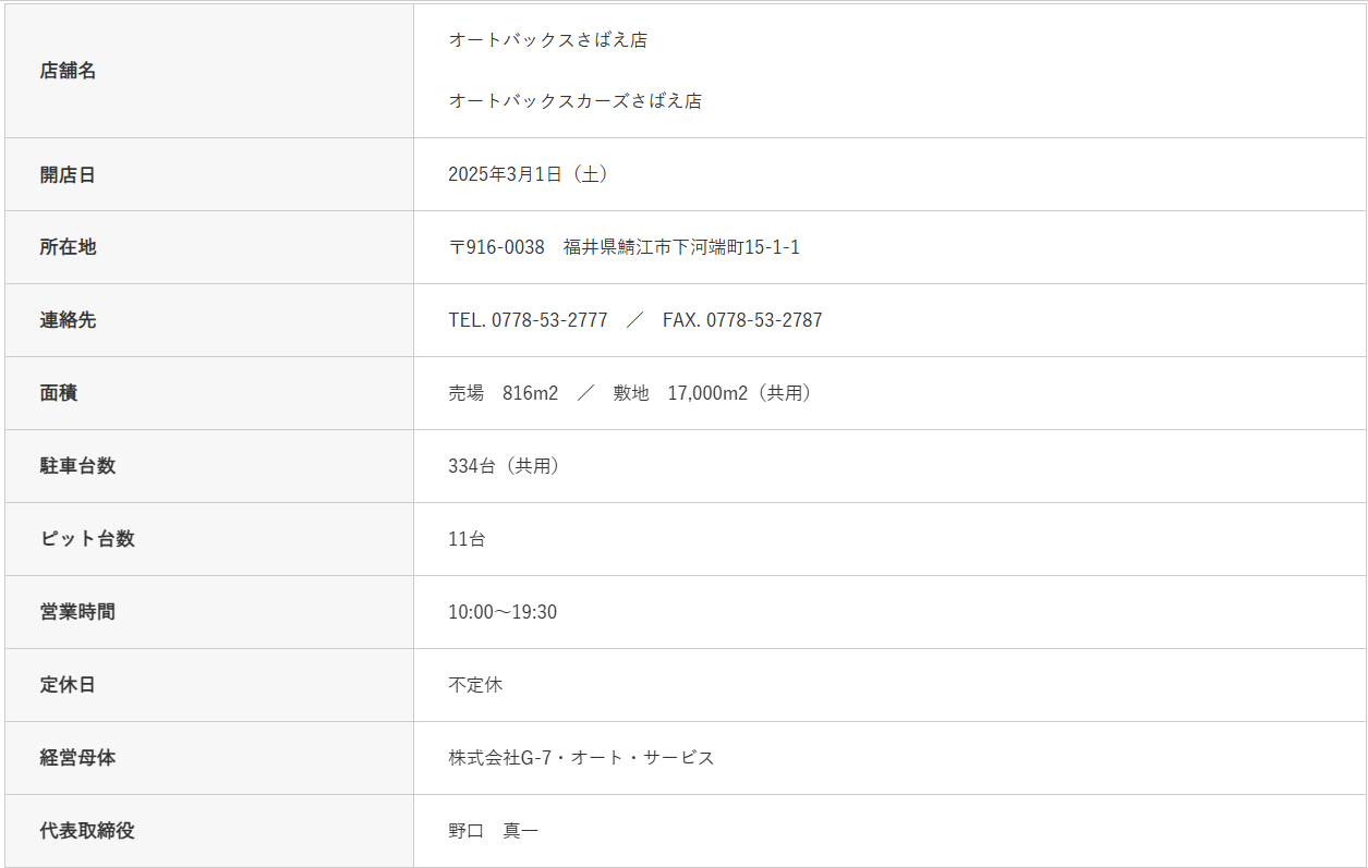 株式会社オートバックスセブン(代表取締役 社長:堀井勇吾)と加盟店契約を結んでいる株式会社G-7・オート・サービス(代表取締役:野口真一)は、2005年4月1日にオープンした「オートバックスさばえ店」を2025年3月1日(土)に移転し、リニューアルオープンいたします。