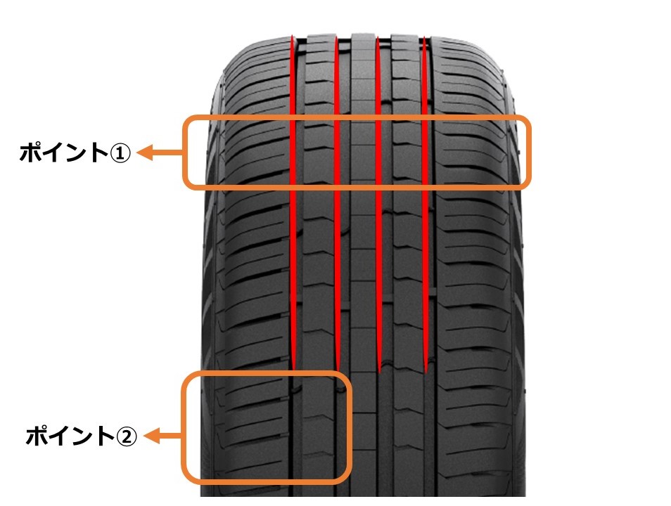 連続したセンターパターンにより、直進安定性が向上します。また大型ショルダーブロックは、ハンドリングの向上に貢献します。