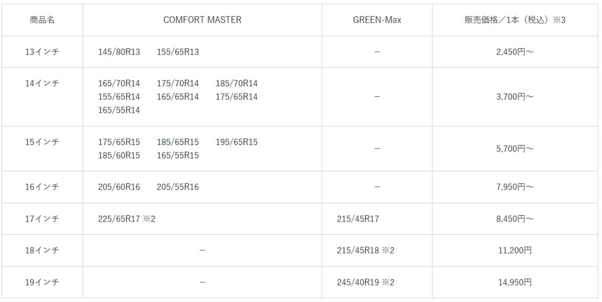 コンフォートマスターは、快適性と静粛性を重視し、17サイズを展開。グリーンマックスは、高いハンドリング性能と排水性能を備えたモデルで3サイズを展開しており、いずれも高性能ながらロープライスを実現しているのが特徴だ。興味のある方は詳細をチェックしてみてはいかがだろうか。