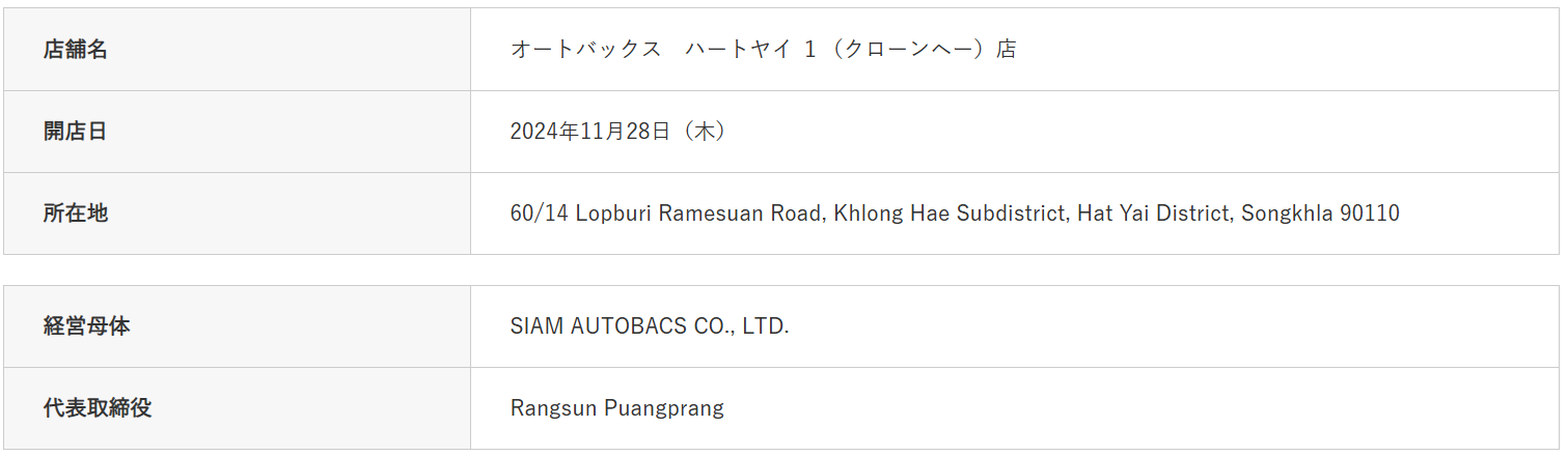 株式会社オートバックスセブン(代表取締役 社長:堀井勇吾)とタイ国内におけるエリアフランチャイズ契約を締結しているSIAM AUTOBACS CO., LTD.(代表取締役:Rangsun Puangprang)は、2024年11月に以下1店舗を新規オープンいたしました。