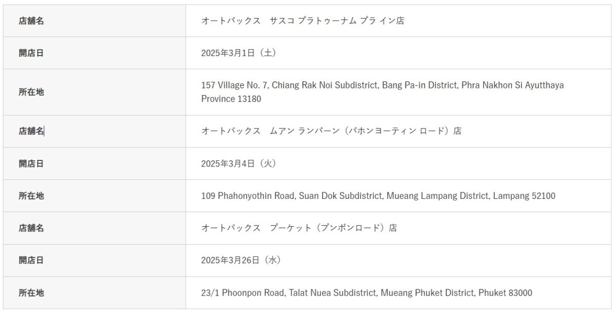 株式会社オートバックスセブン(代表取締役 社長:堀井勇吾)とタイ国内におけるエリアフランチャイズ契約を締結しているSIAM AUTOBACS CO., LTD.(代表取締役:Rangsun Puangprang)は、2025年3月に以下3店舗を新規オープンいたしました。