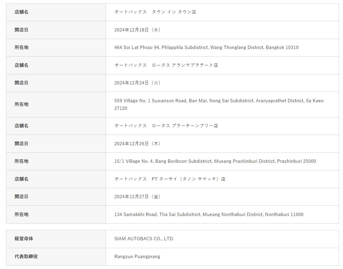 株式会社オートバックスセブン(代表取締役 社長:堀井勇吾)とタイ国内におけるエリアフランチャイズ契約を締結しているSIAM AUTOBACS CO., LTD.(代表取締役:Rangsun Puangprang)は、2024年12月に以下4店舗を新規オープンいたしました。