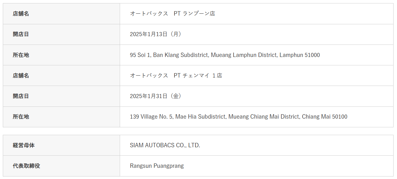 株式会社オートバックスセブン(代表取締役 社長:堀井勇吾)とタイ国内におけるエリアフランチャイズ契約を締結しているSIAM AUTOBACS CO., LTD.(代表取締役:Rangsun Puangprang)は、2025年1月に以下2店舗を新規オープンいたしました。