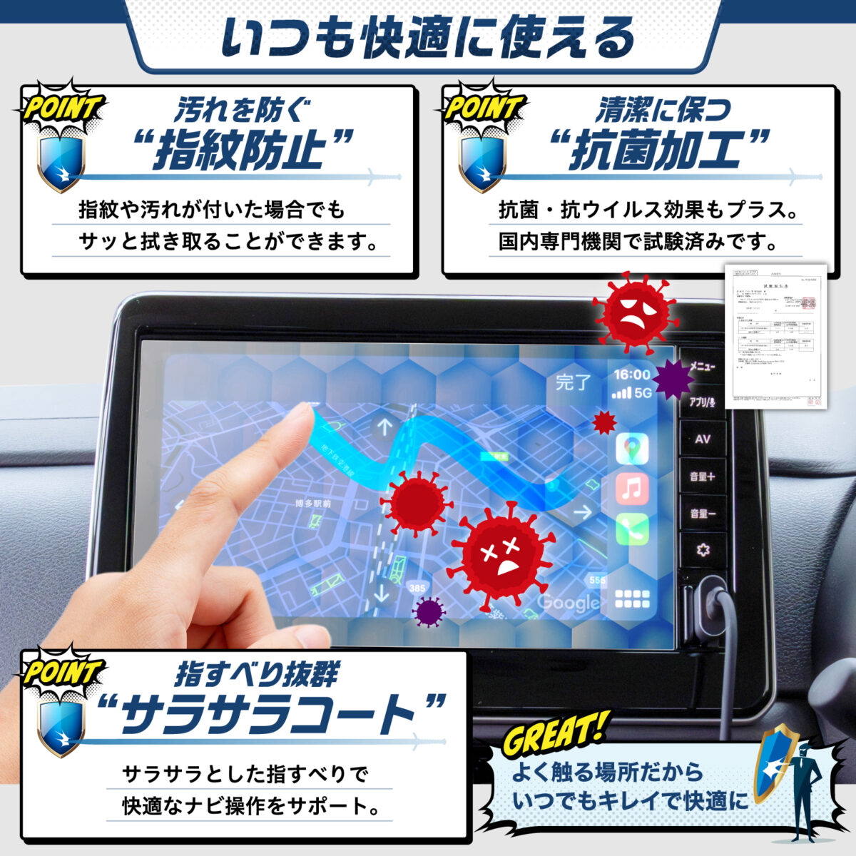 サラサラとした指滑りで快適にナビ操作ができ、指紋や汚れが付いた場合でもサッと拭き取ることができます。
