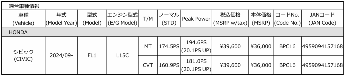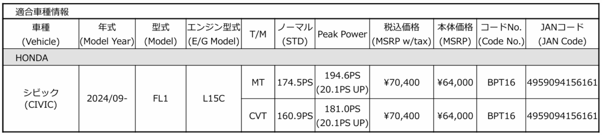 株式会社 ブリッツは、「パワコン / パワスロ」にホンダのシビックの適合を追加し発売した。