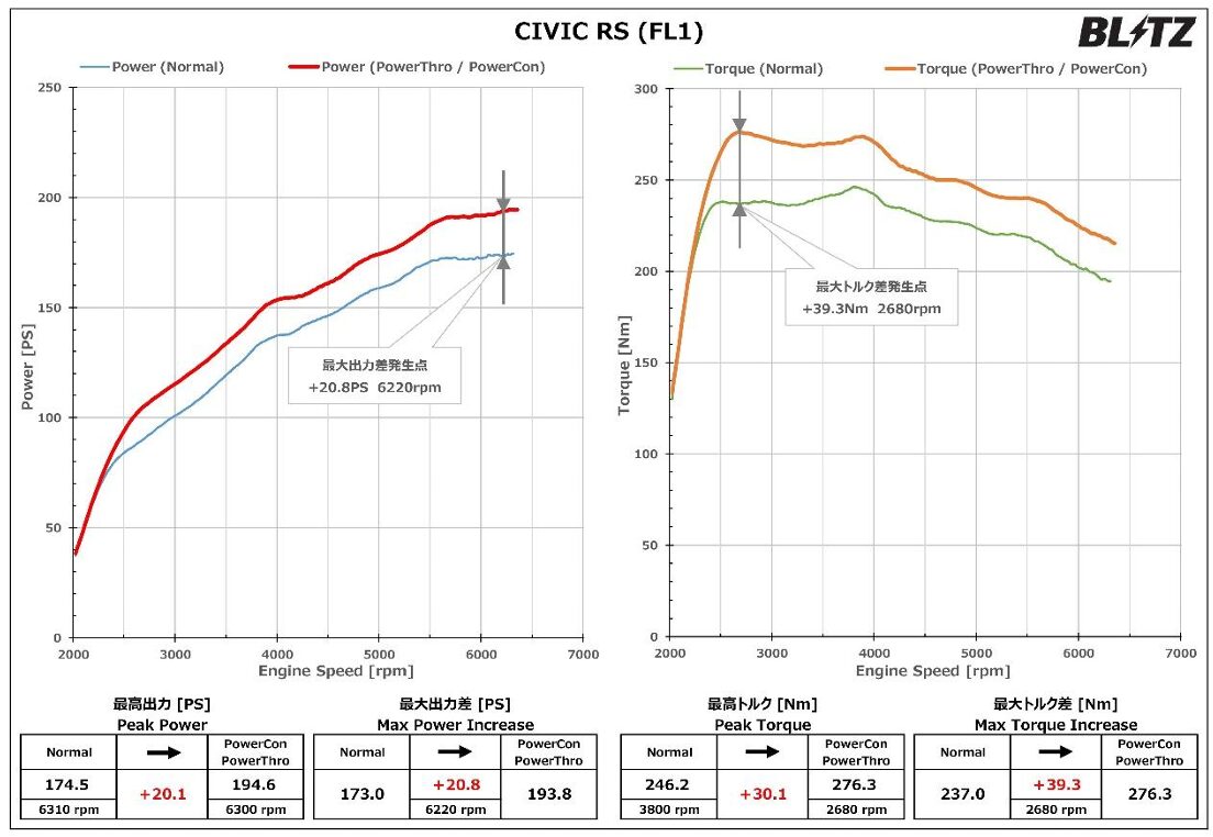 ※弊社シャーシダイナモを用いて計測した、ノーマル車両の出力計測値とパワスロ装着時の出力計測値となります。
