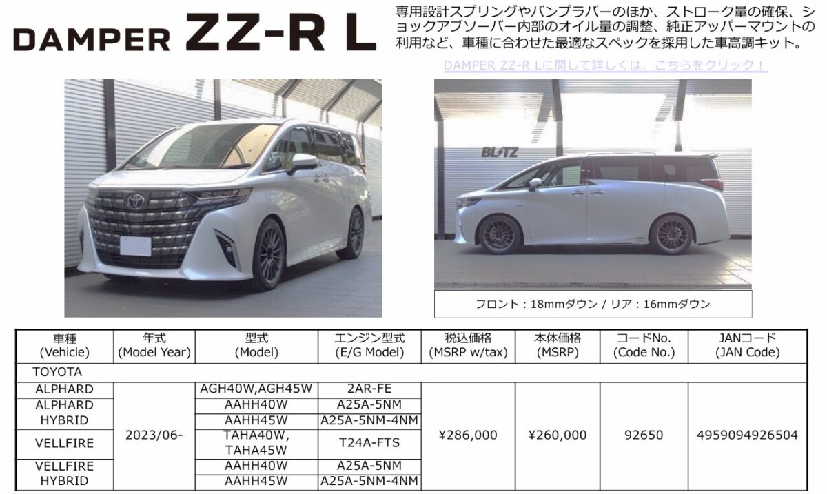 「DAMPER ZZ-R L」TOYOTA ALPHARD/VELLFIRE 他(AGH4#W/TAHA4# 他) ⽤販売開始のご案内