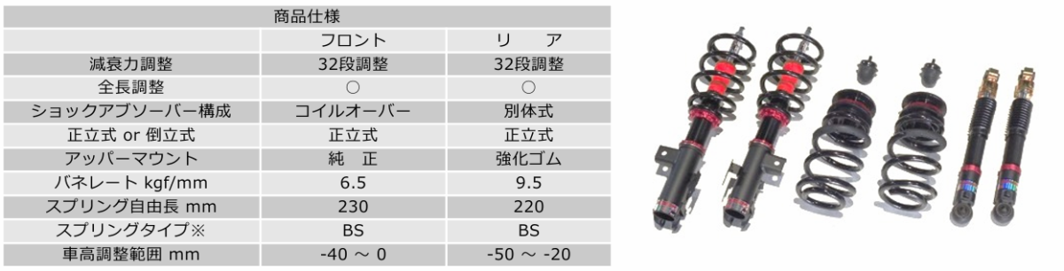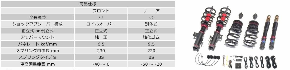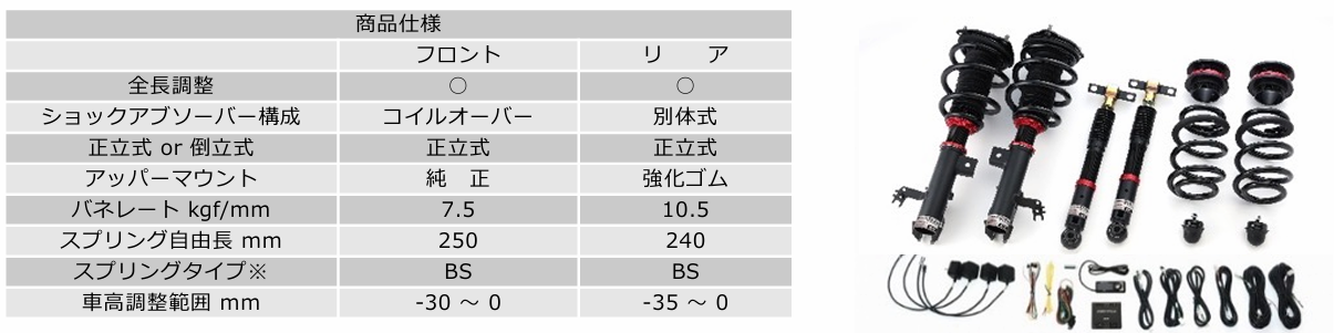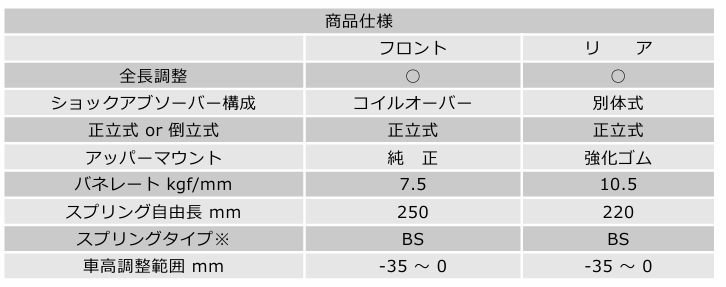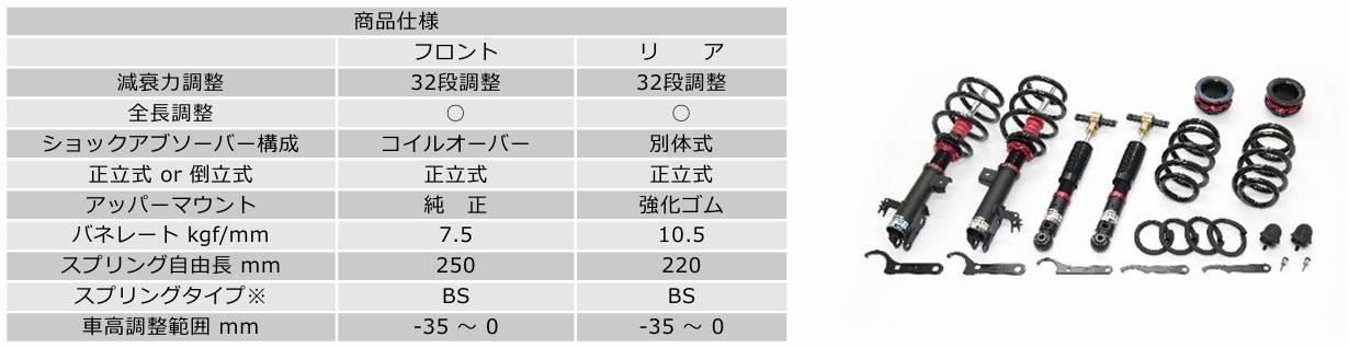 車高調整式サスペンションに交換することで犠牲になりがちな「乗り心地」と「静粛性」には特にこだわり、純正形状に近い専用スプリング、バンプタッチの不快感を抑えるための専用バンプラバーや、ローダウンに対応するショートバンプラバーの付属、純正アッパーマウントとの組み合わせなどを採用。