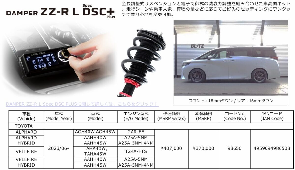 「DAMPER ZZ-R L SpecDSC Plus」TOYOTA ALPHARD/VELLFIRE 他(AGH4#W/TAHA4# 他) ⽤ 販売開始のご案内