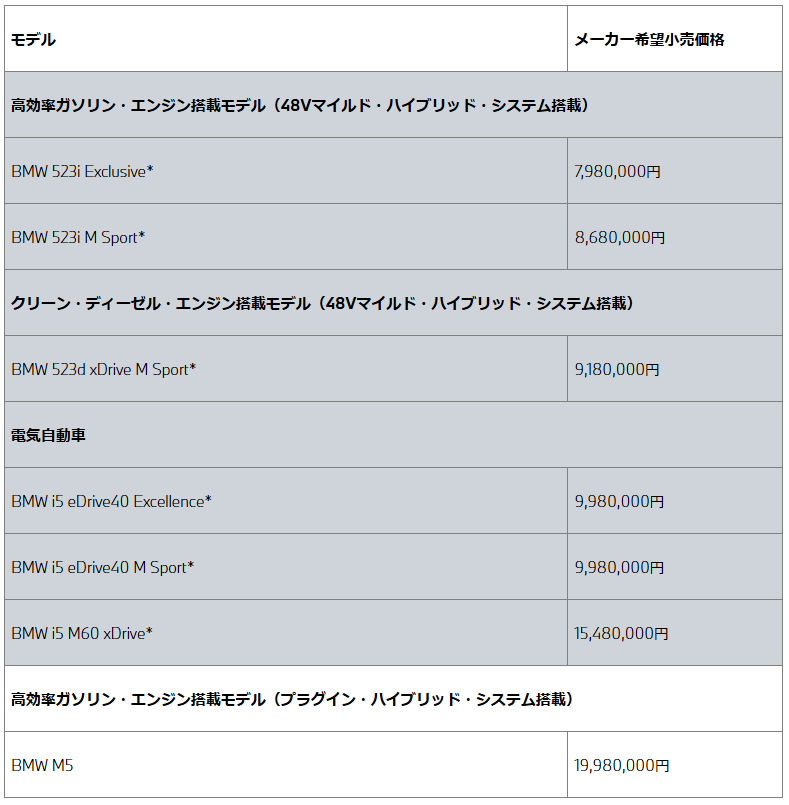 1972年に初代モデルが誕生したBMW 5シリーズは、プレミアム・セグメントにおけるミドル・クラスのセダンとして、世界で最も成功しているビジネス・セダンの代名詞となっている。2023年発表のBMW 5シリーズは第8世代目であり、約7年ぶりのフルモデル・チェンジを行ない、BMW伝統のデザインを踏襲しつつ、コンセプトを一新し、格式のある存在感とエレガントさを同時に高めている。また、走行性能面では、約半世紀の歴史の中で初めて、電気のみで走行する電気自動車BMW i5を量販モデル、Mパフォーマンス・モデルの2モデルを同時にラインアップしている。さらに、BMW 5シリーズにおいて初となる48Vマイルド・ハイブリッド・システムを、ガソリンおよびディーゼル・エンジン搭載モデルに搭載する等、パワートレインを充実させている。更に、先進のデジタル技術で、高い安心、安全、快適な機能を提供し、そのプレミアム・ミドル・クラスのセダンをリードする地位を揺るぎないものとしている。