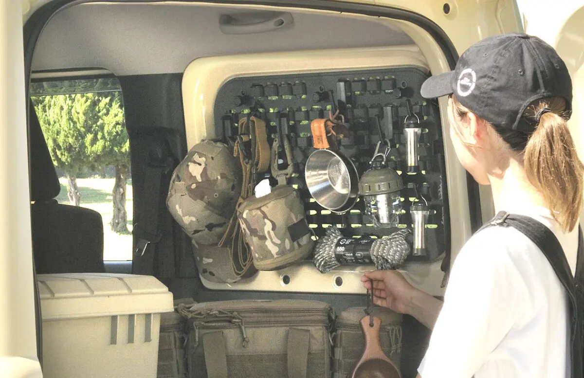 近年、”モールシステム”に対応した車のカスタマイズアイテムが、キャンパーやサバイバルゲーム愛好者の中で見かけるようになりました。そこで、オリジナルのカスタマイズを楽しむユーザーが多いジムニーにおいて、壁面収納に役立つ専用設計のパネルを開発しました。ポーチを始めとした”モールシステム”対応アイテムのベルトが通しやすいよう、凹凸のあるオフセット構造を採用。また、付属のアタッチメントを活用することでアウトドアなどの小物類も収納することができます。