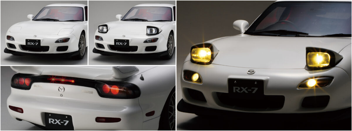 リモコン操作によりRX-7を象徴するリトラクタブルヘッドライトの開閉、点灯が可能。ウインカーやブレーキランプ、テールライトも実車さながらに点灯する。