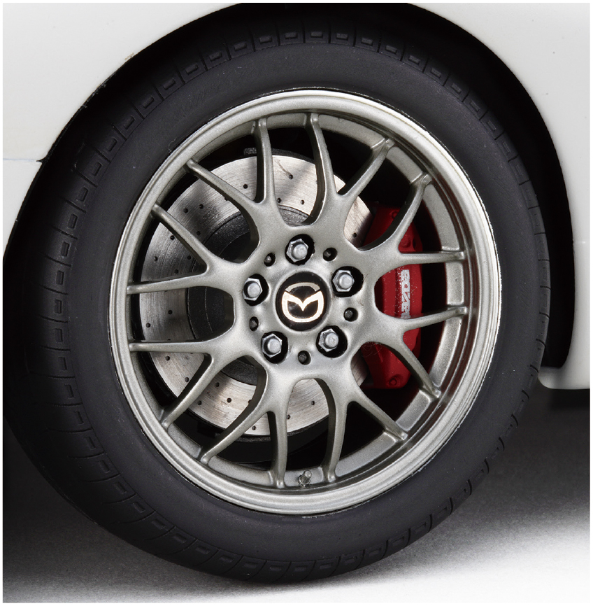 スピリットR独自のBBS社製17インチアルミホイールも細部にわたって忠実に再現。内部には赤いブレーキキャリパーを持つ、ベンチレーティッドディスクブレーキが覗く。