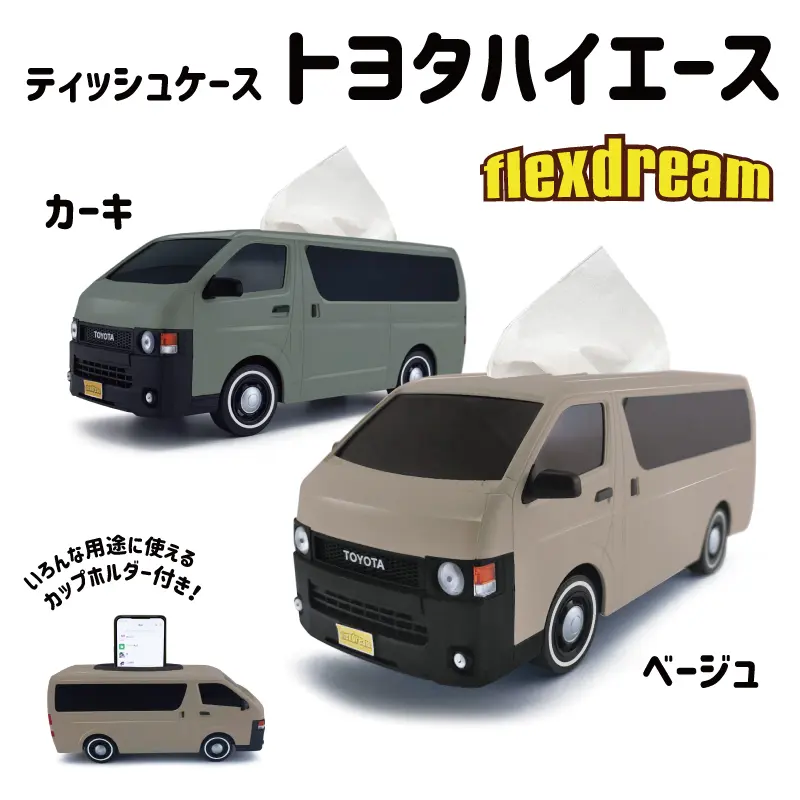 同製品は、トヨタ自動車、flexdream公認のライセンス商品で、アウトドアを楽しめるハイエースとして人気のデザインの丸目ハイエースをそのままティッシュケースにしているのが特徴だ。ティッシュケース以外にペン立てなどとしても使用可能で、オシャレなカーキとベージュの2色展開となっている。
