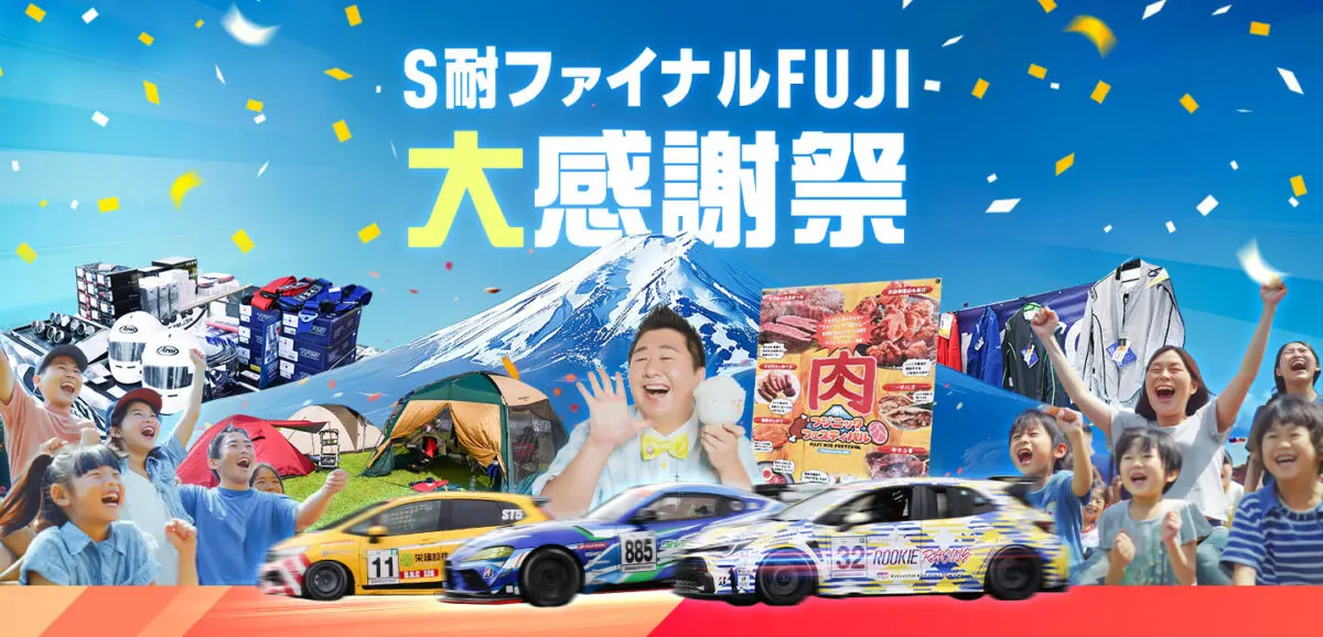 「S耐ファイナルFUJI 大感謝祭」と題された当イベントでは、いよいよシリーズチャンピオンが決定するスーパー耐久(S耐)最終戦に併せ、昨年大好評をいただいた「肉」をテーマにした食フェス『フジニック フェスティバル』、レーシングチーム、カー用品のショップ、メーカー等が多数出展する『スーパー ガレージセール』を併催します。