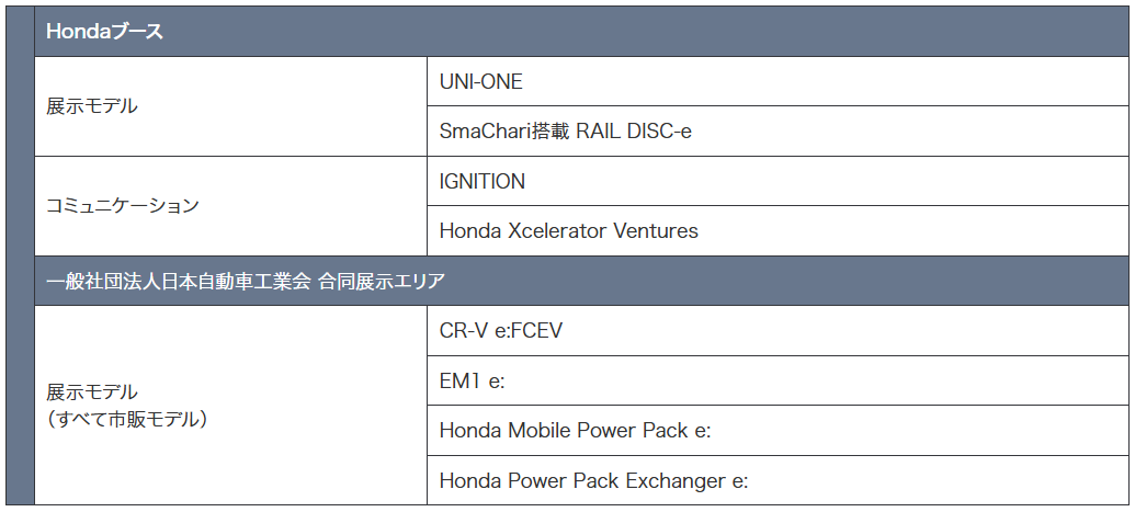 また、一般社団法人日本自動車工業会 合同展示エリアでは燃料電池車「CR-V e:FCEV(シーアールブイ イーエフシーイーブイ)」、電動二輪パーソナルコミューター「EM1 e: (イーエムワン イー)」などの車両展示を行います。