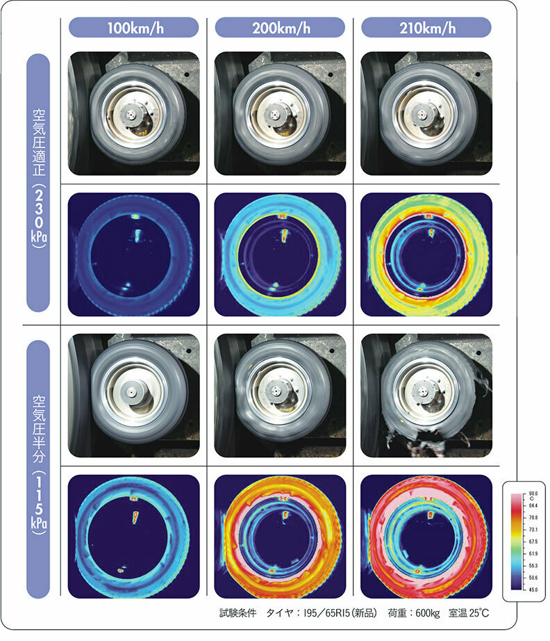 JAFは適正空気圧と空気圧半分の2パターンで、速度を上げながらタイヤの状態を観察し、温度も計測しました。結果は、時速200kmから空気圧半分のタイヤの表面が波打つ現象が発生し温度は100℃を越え、時速210kmになると、さらに波打ちが激しくなりバーストしました。