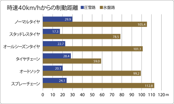 その結果、雪道でのノーマルタイヤの制動距離は29.9mでスタッドレスタイヤの17.3mに対して約1.7倍でした。