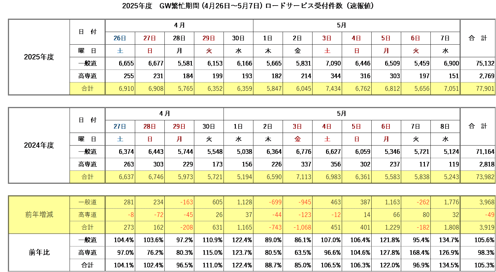 JAF(一般社団法人日本自動車連盟 会長 坂口正芳)は、ゴールデンウィーク期間(4月26日~5月7日まで)のロードサービス受付件数(速報値)をまとめました。
