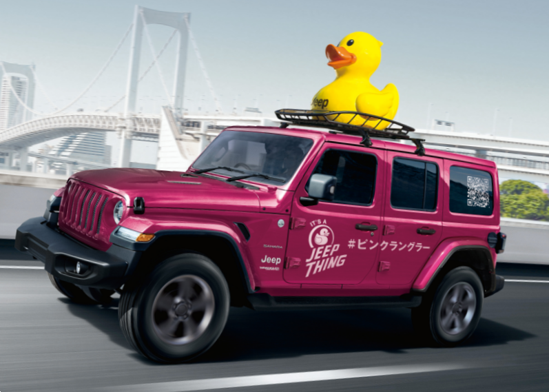 ピンク色にラッピングされた3台の「Jeep® Wrangler」が、キャラバンスタイルで全国のジープ正規ディーラーを巡ります。車両の側面には、「#ピンクラングラー」のサインとQRコードを大胆にデザイン。先頭車両の屋根には、遠くからでも目を引く特大サイズの「Jeep Duck」を乗せ、市街地や人気スポットを走行します。道行く人々の注目を集めることは間違いありません。本イベントは、東京からスタートし、全国各地を巡って福岡でフィナーレを迎える予定です。