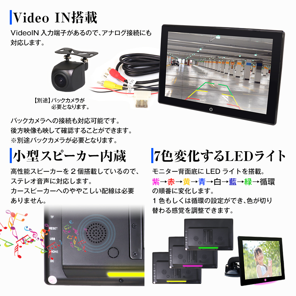 モニター背面底にLEDライトが搭載しています。紫→赤→黄→青→白→藍→緑→循環の順番に変化します。1色もしくは循環の設定ができます。さらに色が切り替わる感覚を調整できます。車内をおしゃれに演出します。