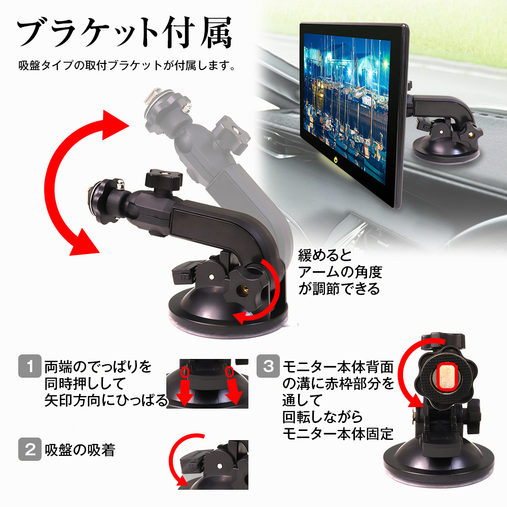 裏面に取付ブラケット用の溝があるので、対応ブラケットを利用すればオンダッシュモニターにも後部座席モニターとしても使用することができます。