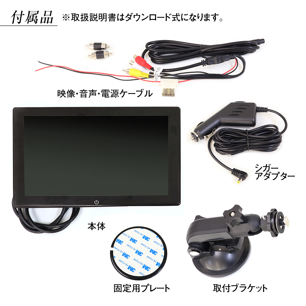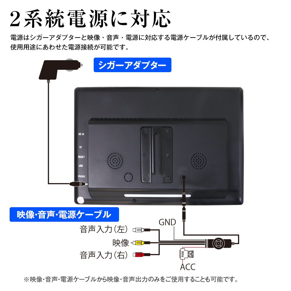電源はシガーアダプターと映像・音声・電源に対応するバッテリー電源ケーブルが付属しているので、使用用途にあわせた電源接続が可能です。