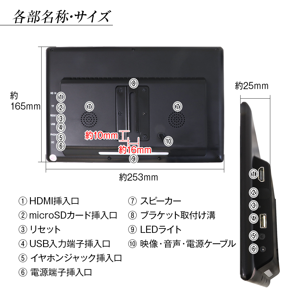 サイズ:約253(W)×約165(H)×約25(D)mm(本体最大部・スタンド含まず)