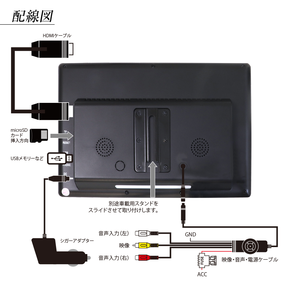 スピーカー内蔵しAIBOXやゲーム機・TVstickなどを接続できる車載大型モニター