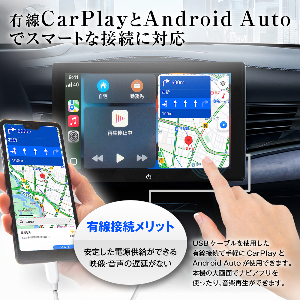 USBケーブルを使用した有線接続で手軽にCarPlayとAndroid Autoが使用できます。本機の大画面でナビアプリを使ったり、音楽再生ができます。