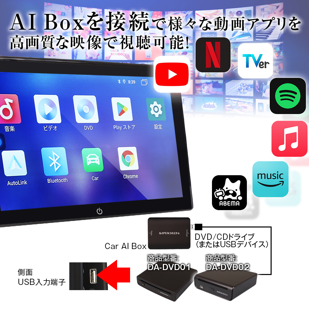 Car AI Boxに対応した機器(別売DA-DVD01などに対応)と接続すると、Youtubeなどの動画アプリやDVDも視聴できます。