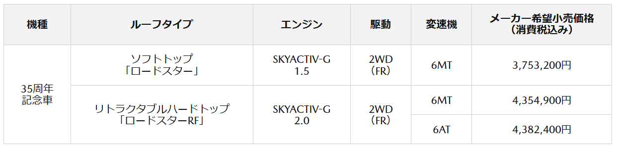 • 1989年に初代ロードスターが誕生してから35周年を迎えることに対するお客さまへの感謝の気持ちを込めた特別仕様車。