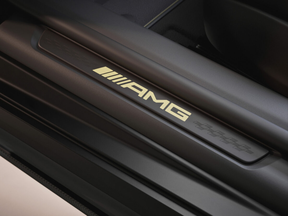 MANUFAKTUR イルミネーテッドステップカバーには、AMG のレタリングが施されています。また、AMG フロアマットには、レースゴールドの「APXGP」ロゴが刺繍されたレザーパーツが付属しています。さらに、センターコンソールに装備されるバッジには「Limited Edition 1 of 52」の文字が記され、「GT 63 APXGP Edition」の希少性を際立たせます。