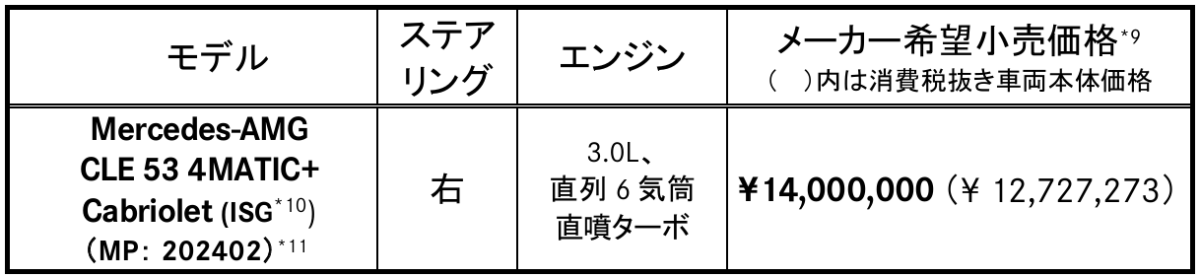 メルセデス・ベンツ日本合同会社は、CLEカブリオレに新しく「Mercedes-AMG CLE 53 4MATIC+ Cabriolet (ISG) 」を追加し、全国のメルセデス・ベンツ正規販売店ネットワークを通じて発売した。