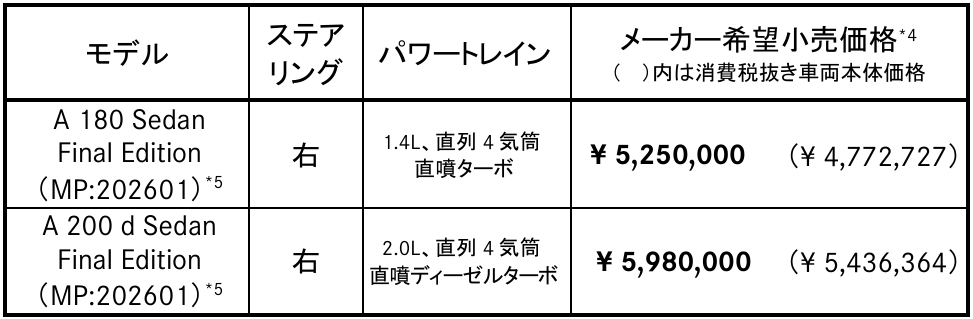 メルセデス・ベンツ日本合同会社(社長 兼CEO:ゲルティンガー 剛、本社: 千葉県千葉市)は、A クラスセダンに「A 180 Sedan Final Edition」、「A 200 d Sedan Final Edition」を追加し、全国のメルセデス・ベンツ正規販売店ネットワークを通じて本日より発売します。