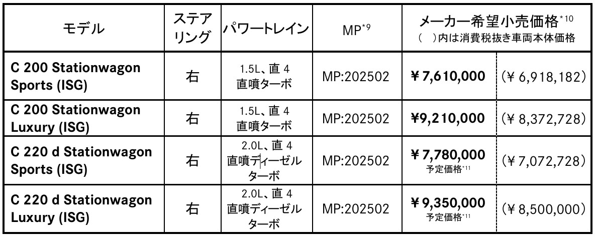 *6: C 200 AVANTGARDE(ISG搭載モデル)【MP202501】、C 220 d AVANTGARDE(ISG搭載モデル)【MP202501】、C 200 Stationwagon AVANTGARDE(ISG搭載モデル)【MP202501】、C 220 d Stationwagon AVANTGARDE(ISG搭載モデル)【MP202501】