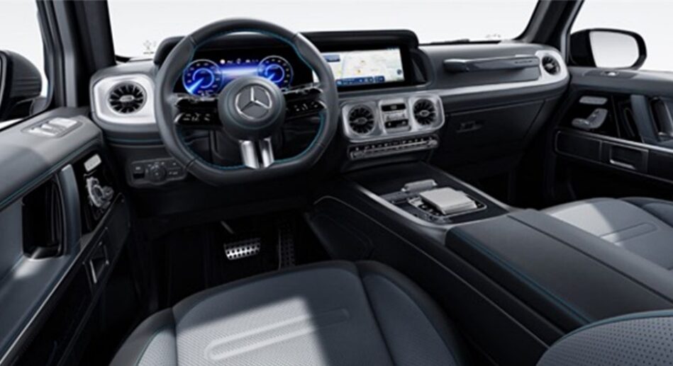 上質な素材とクラフトマンシップが融合したラグジュアリーなインテリアや、丸型のエアアウトレットや助手席側のグリップハンドルなど G クラス伝統のデザインを踏襲したものとなっています。特徴的なデフロック機能のスイッチ周辺は G 580 専用に再設計され、G-TURNや G-STEERINGの起動スイッチがレイアウトされています。また、MBUX や最新世代のマルチファンクションステアリングホイール、キーレスゴー、Burmester®3D サラウンドサウンドシステムなど最新の装備を取り入れることで先進性と利便性も大幅に高まっています。