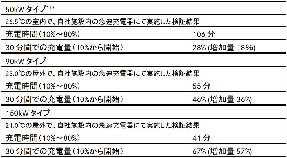 なお、直流急速充電(CHAdeMO 規格)*12の充電時間は以下の通りです。