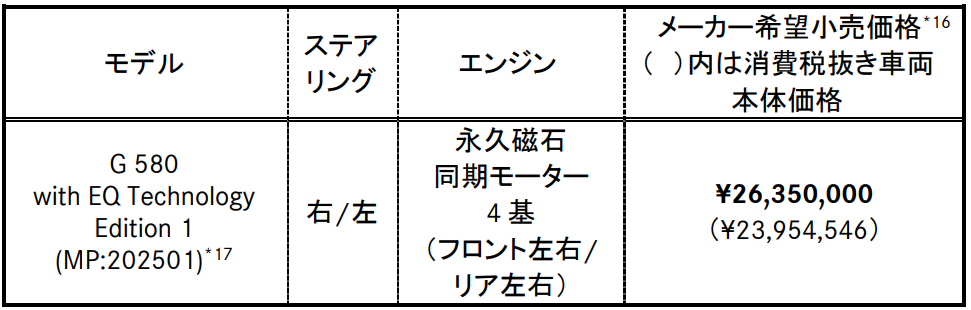 メルセデス・ベンツ日本合同会社(社長 兼 CEO:ゲルティンガー剛、本社:千葉県 千葉市)は、メルセデスが誇る究極のオフローダーである G クラスの電気自動車 「G 580 with EQ Technology Edition1 エディション ワン 」を発表し、本日よりメルセデス・ベンツ正規 販売店ネットワークを通じて注文の受け付けを開始し、お客様への配車は 2024 年 11 月を予定しております*2。