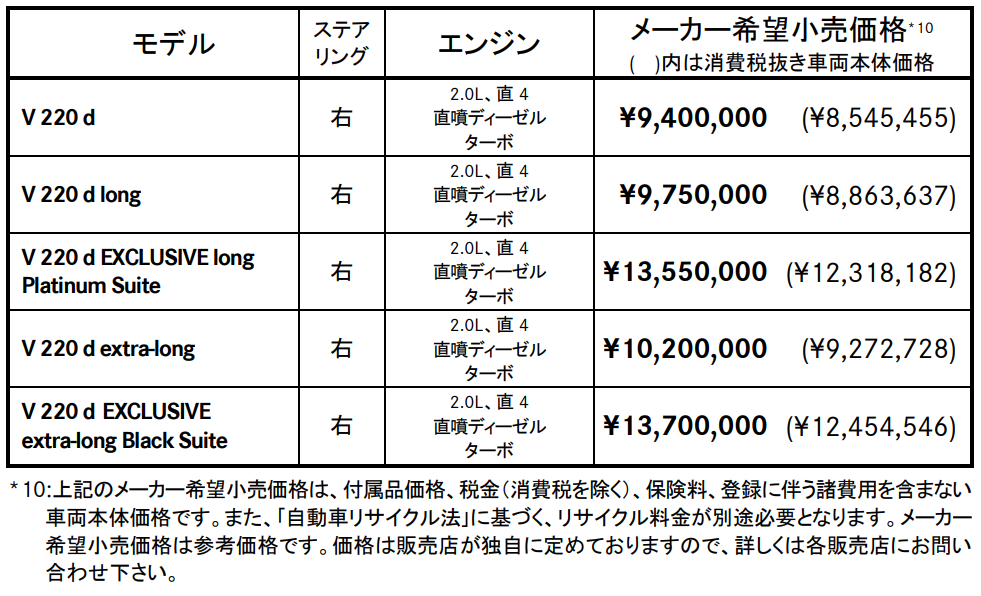 *1: V 220 d EXCLUSIVE long Platinum Suite、V 220 d EXCLUSIVE extra-long Black Suite