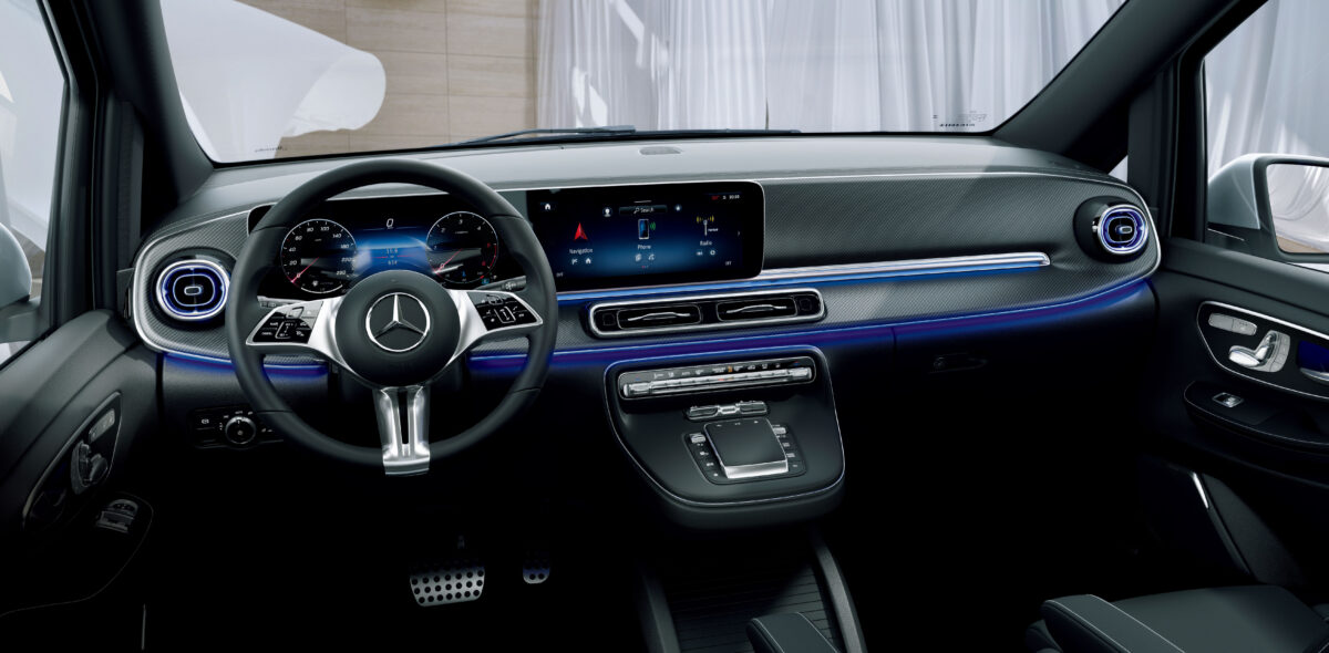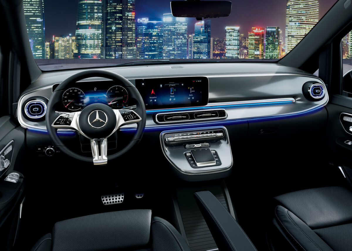 V 220 d、V 220 d long、V 220 d extra-long(標準仕様)では全席本革シートを備え、新しく採用された「ダークグレイオープンポアオリーブウッドルックインテリアトリム」、AMGラインパッケージでは「カーボンルックインテリアトリム」を採用。
