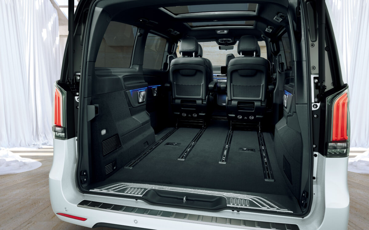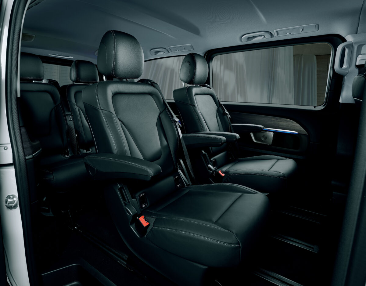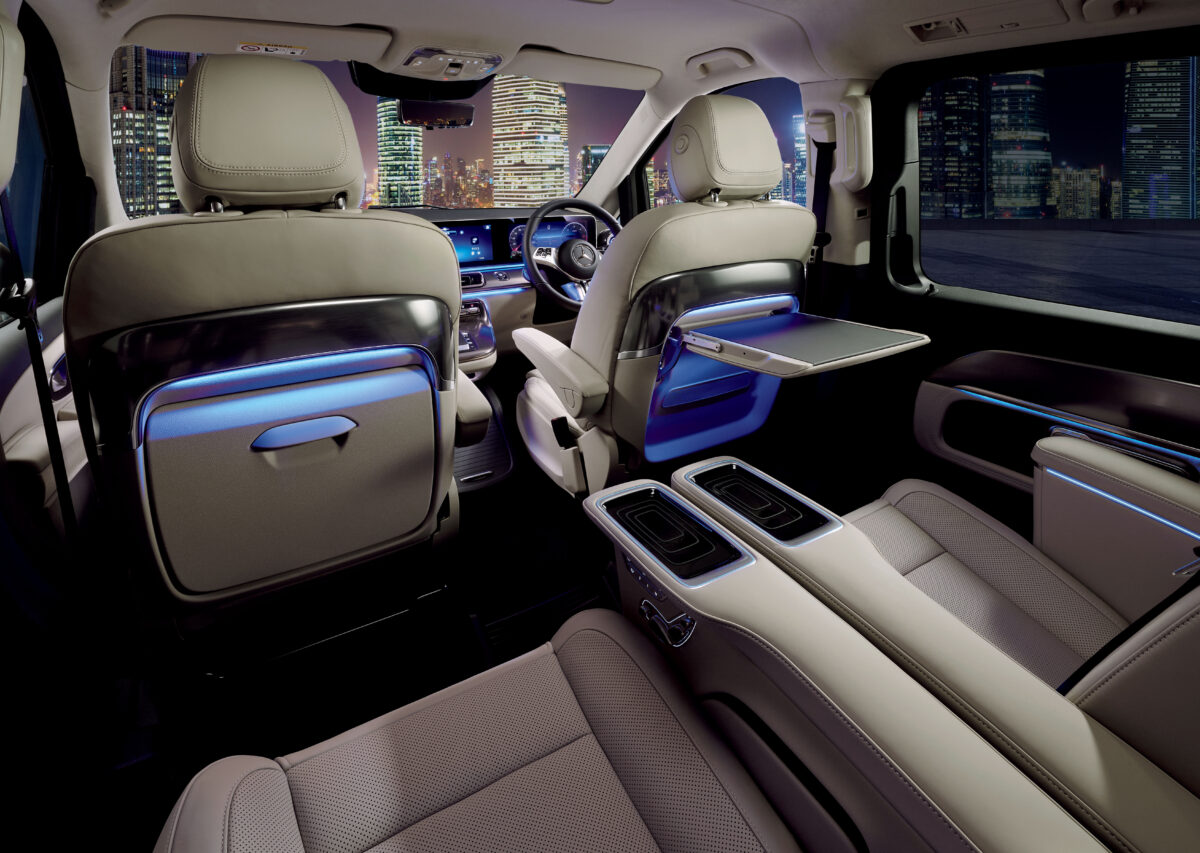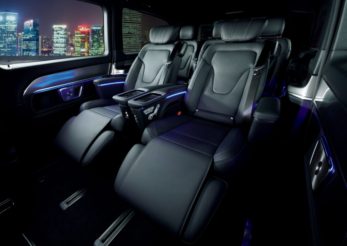 V 220 d EXCLUSIVE long Platinum Suite、およびV 220 d EXCLUSIVE extra-long Black Suiteには煌びやかな「アルミニウムインテリアトリム」と全席ナッパレザーシートが採用され、高級感あふれる空間を演出します。さらに、2列目にはエクスクルーシブシートを標準装備*6。フットレストが装備され、リクライニング機能、リラクゼーション機能、シートベンチレーター(シートヒーター機能含む)、ヘッドレストクッション・レッグレスト・フットレストのサポート、折りたたみ式テーブルを備え、長距離ドライブでも乗員に快適な空間を提供します。エクスクルーシブシートにはカップホルダー、USB-Cポート、スマートフォン用のトレイが組み込まれています。